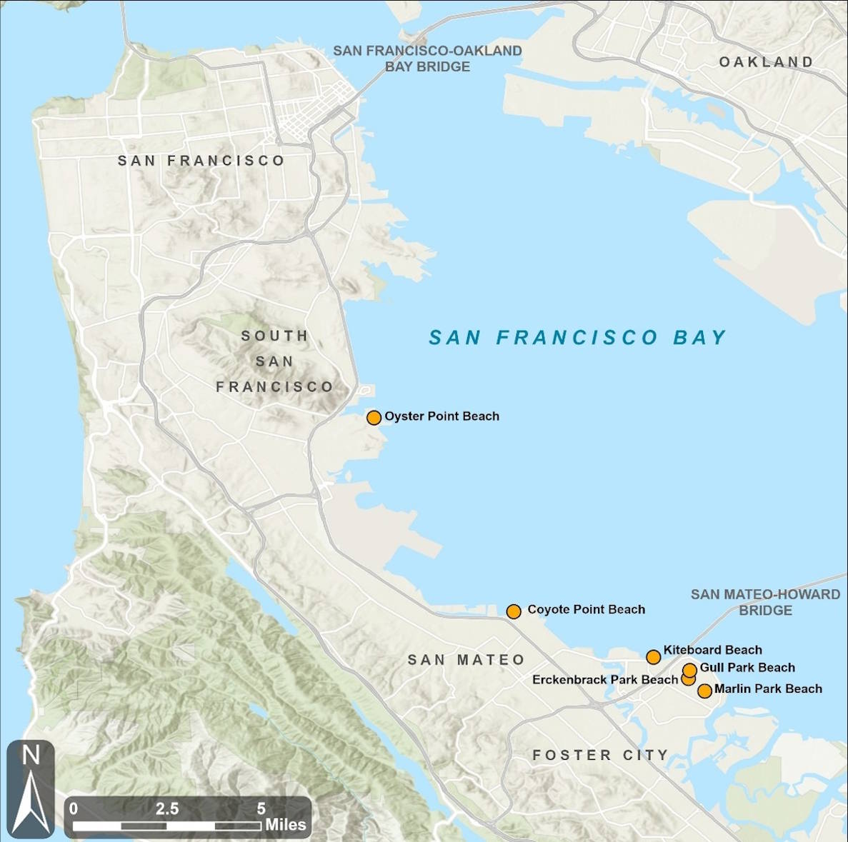 Oyster Point Beach in the City of South San Francisco, Coyote Point Beach parkland in San Mateo County; and Kiteboard Beach, Gull Park Beach,
